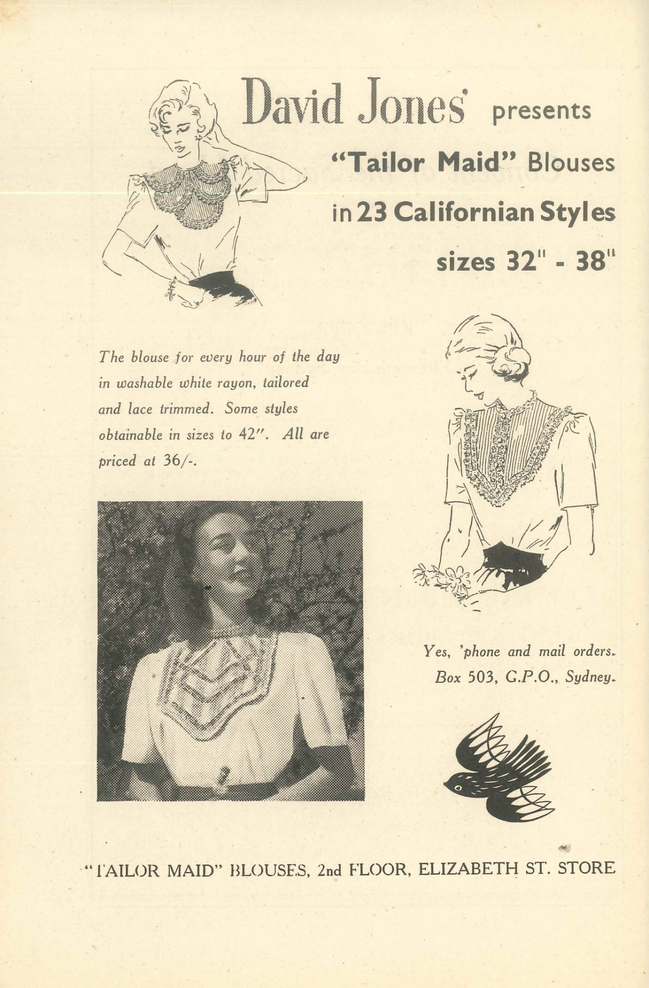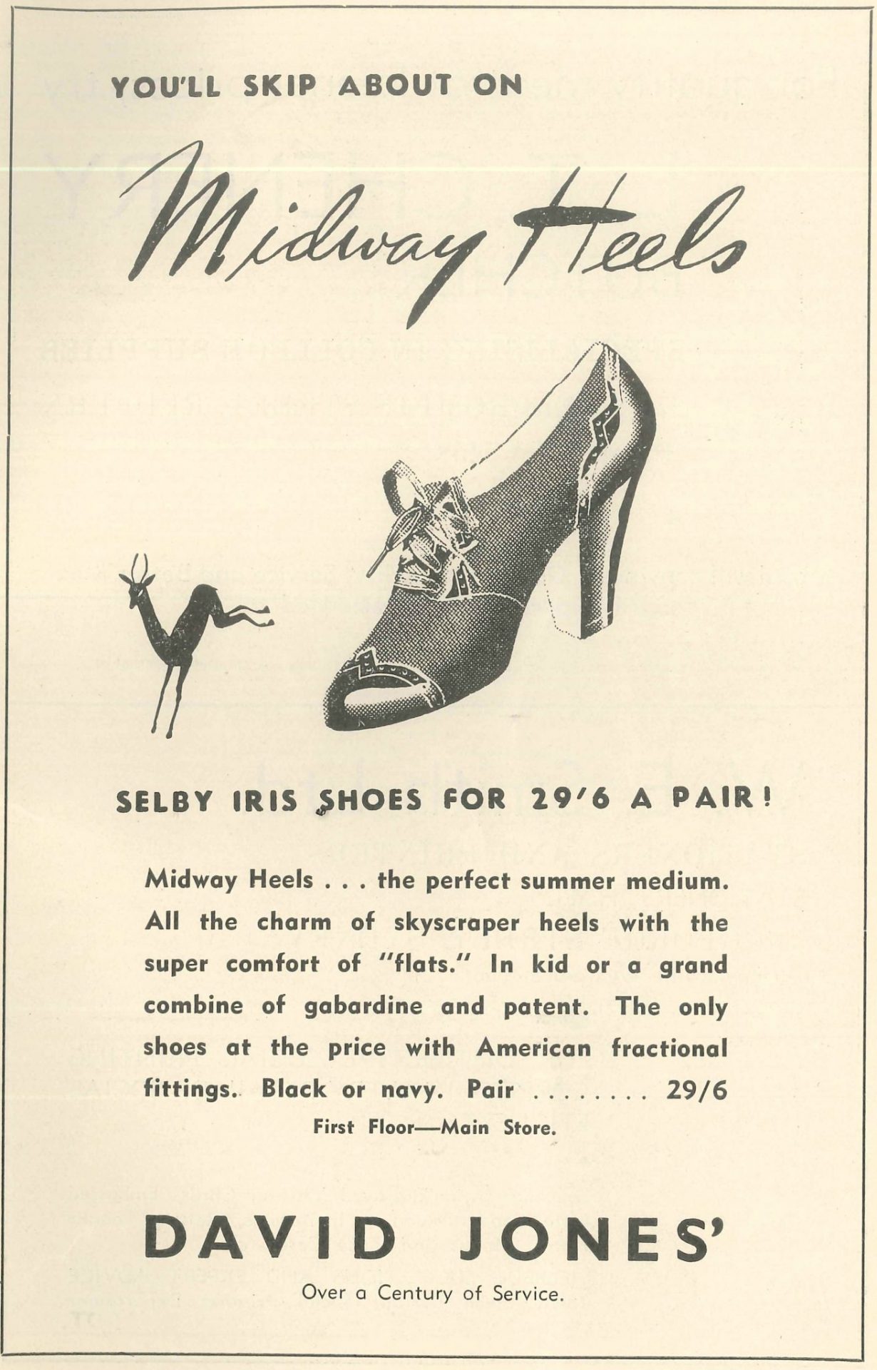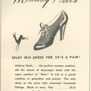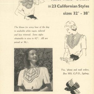 And where there’s a party, there’s shopping! In 1939, a young lady could “skip about” on her Selby Iris shoes with midway heel from (there’s no other store like) David Jones for the sum of 29 shillings and sixpence (around $129.60 in today’s figures). A decade later, she could snap up a “tailor-made” blouse in 23 Californian styles for 36 shillings (or $101 in 2019). No online shopping in the ‘good old days’!