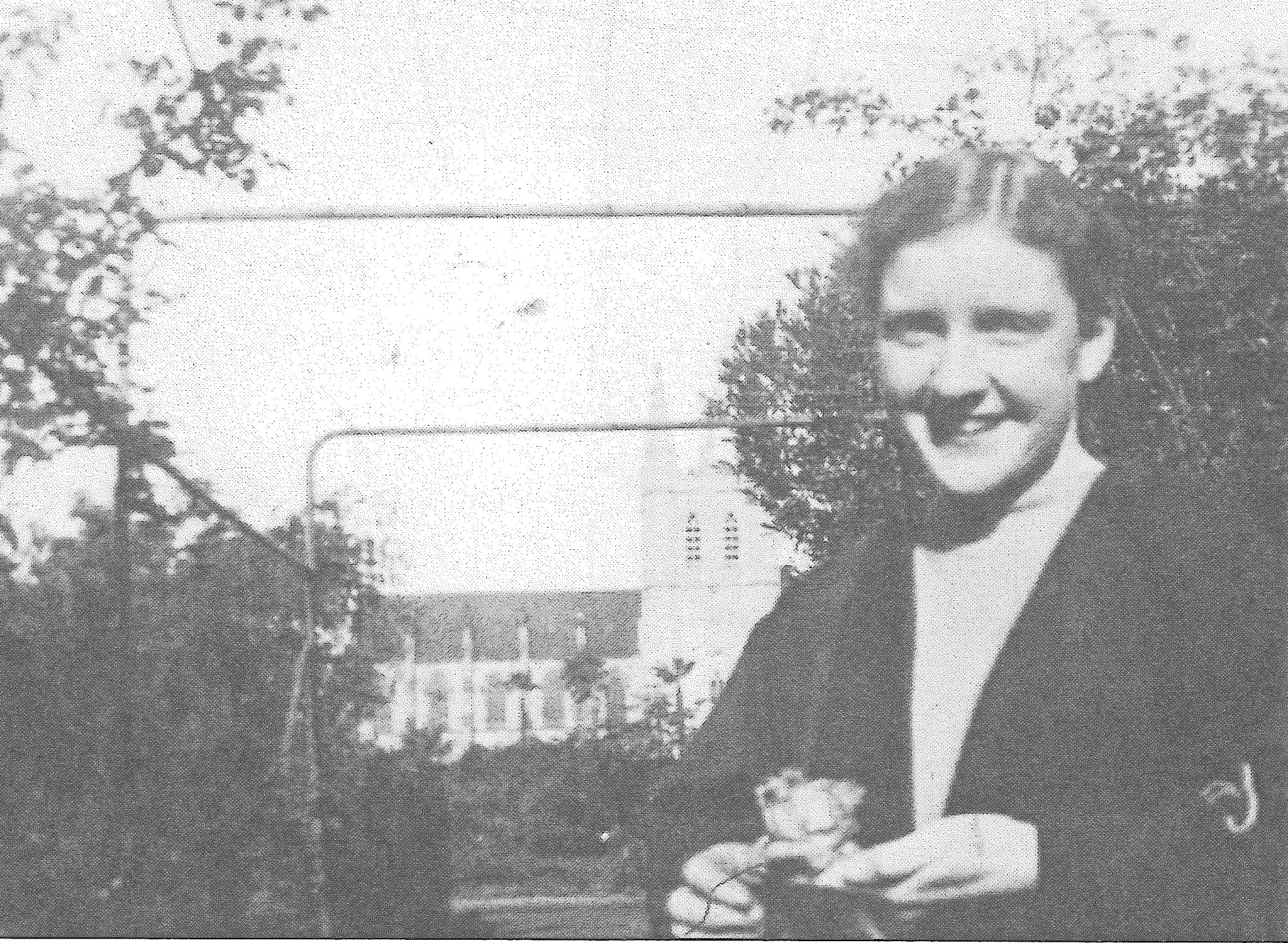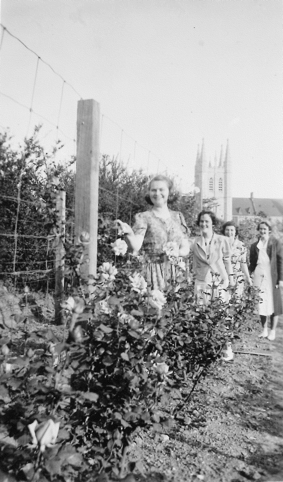 Basketball teams 1944 from College magazineMarie Leahy and Maureen O’Neill from 1939 College magazineLooking through the Rose Walk towards St John’s, Wanda Knudson c1940The sundial and Barbara from 1944 College magazineFour women in garden with St Johns College in background