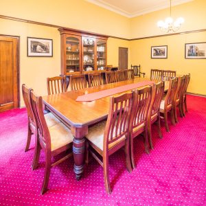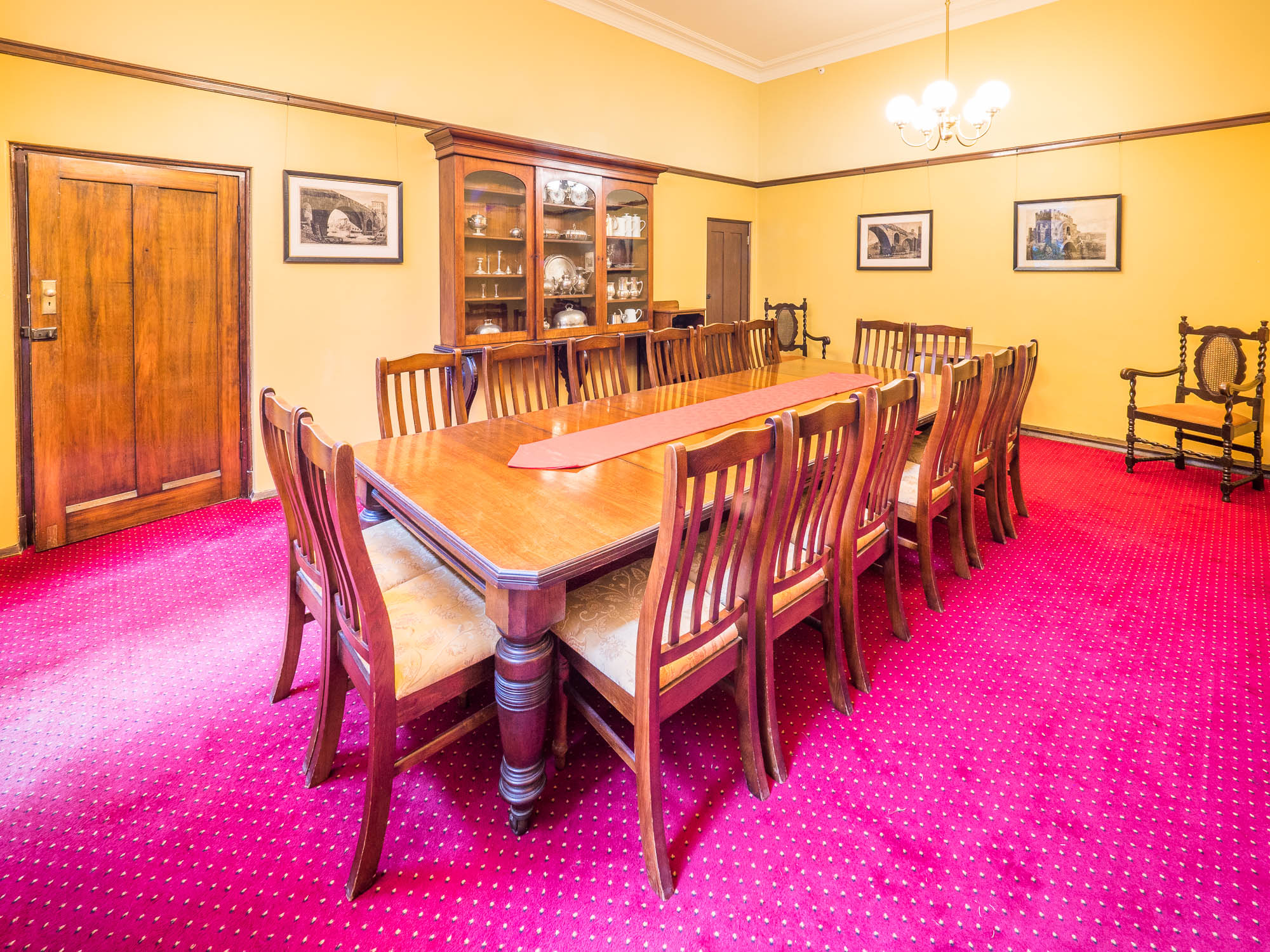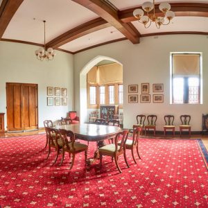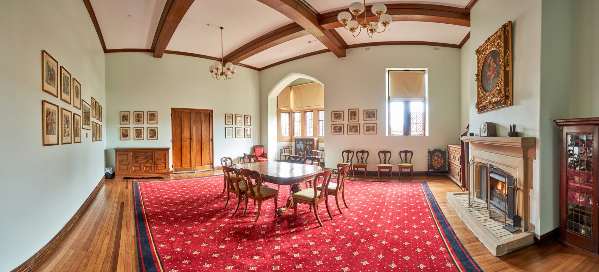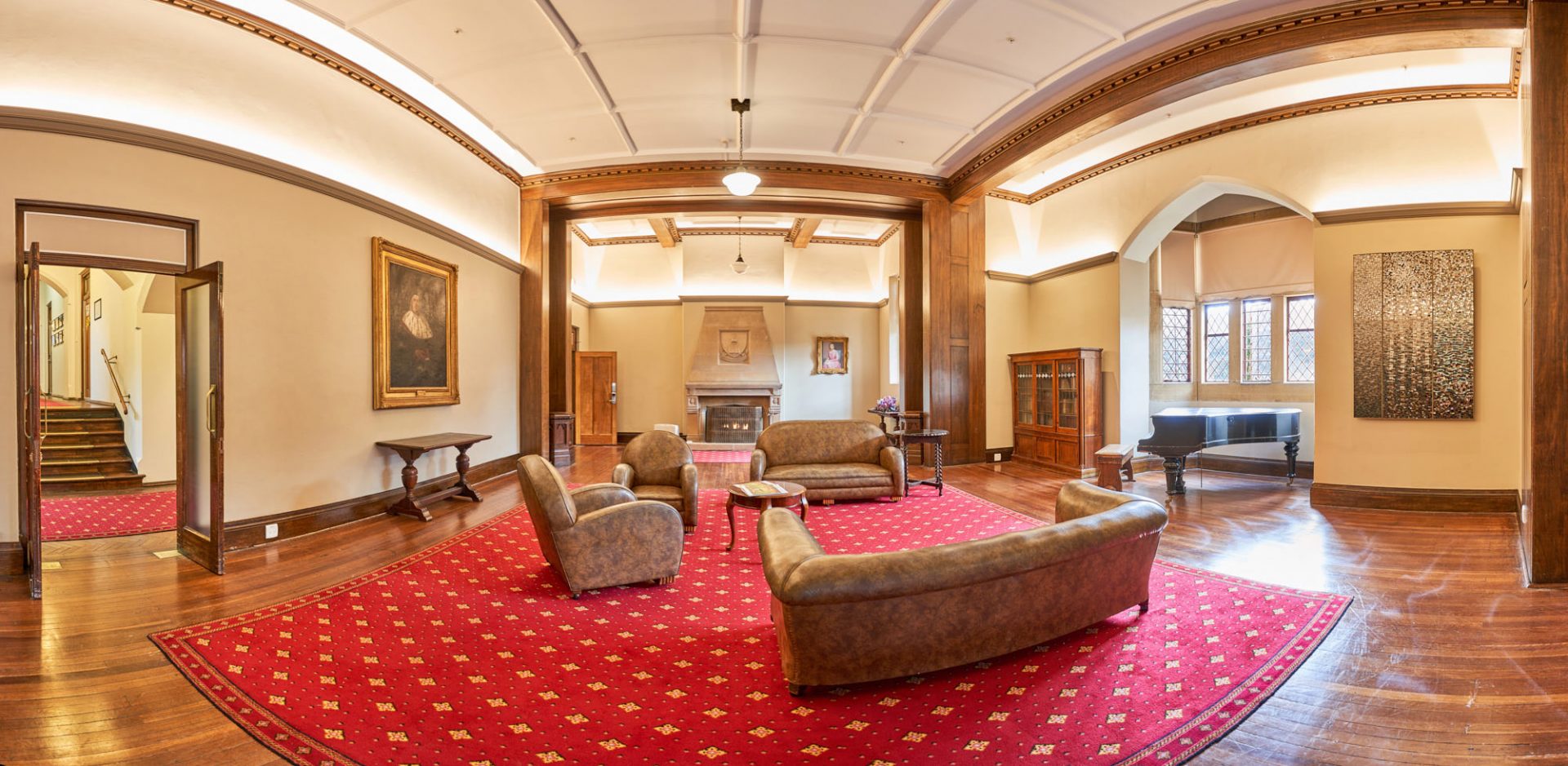 Leather sofas, a sandstone fireplace and a grand piano add elegance to the Lower Common Room which is used for gatherings, meetings, drinks, coffee, Formal Dinner evenings, special events, concerts, debates and exhibitions. Students use the room and the grand piano freely.