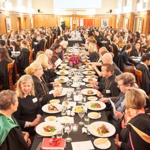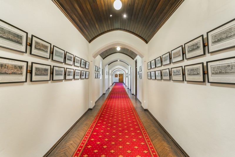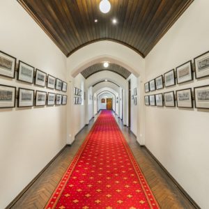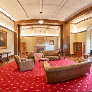 The driveway leads past Sancta Sophia Graduate House to the Foyer and Reception area where staff are available for students and visitors. The hall, lined with student year photos dating from 1926, leads to the grand Lower Common Room and beyond into the College.