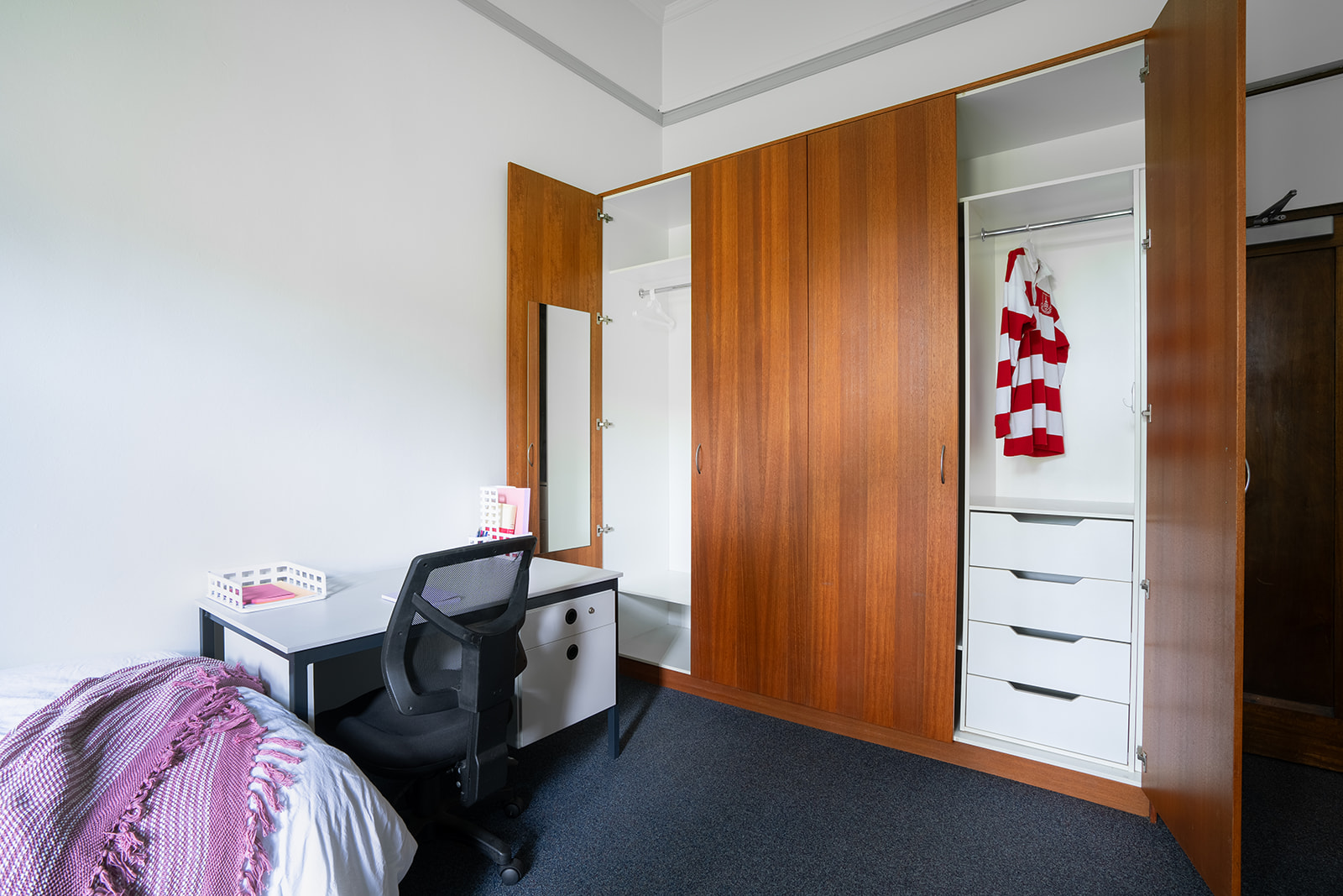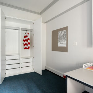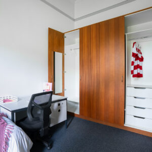 The Heritage Building offers a variety of room options, including single king and double beds. Each room features a built-in wardrobe and storage space for your belongings, a large desk with a chair and lamp for studying, and amenities like a ceiling fan and heater for year-round comfort.