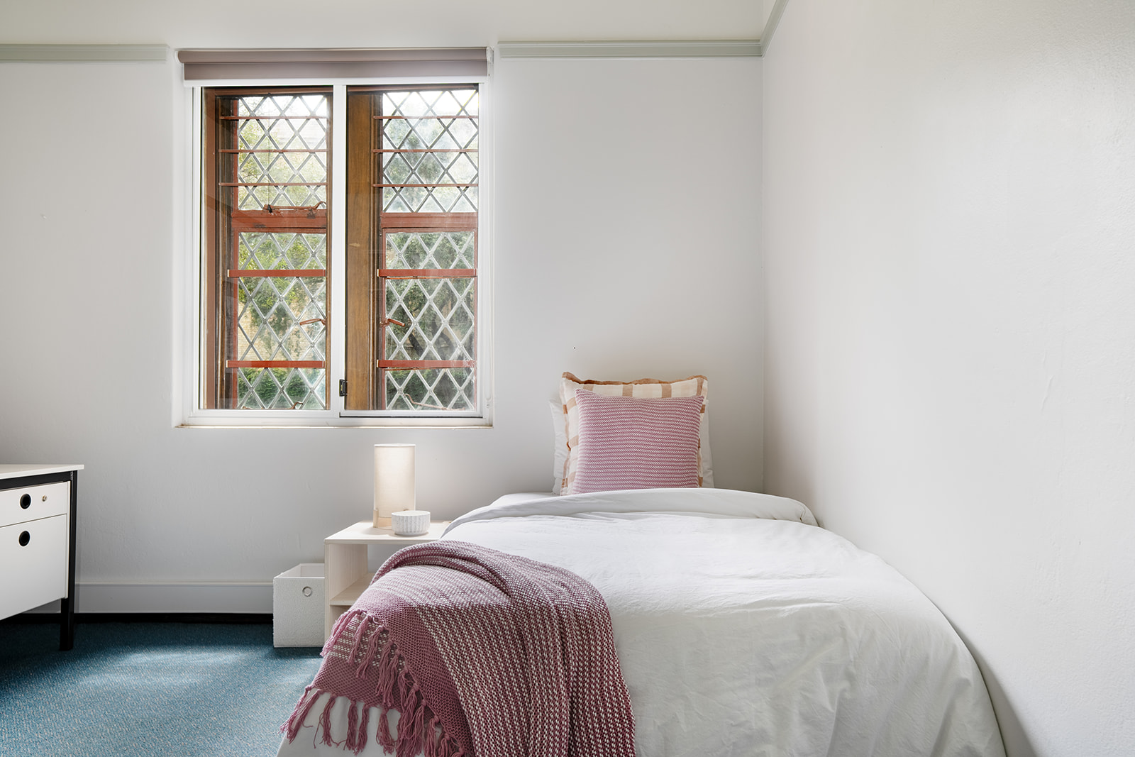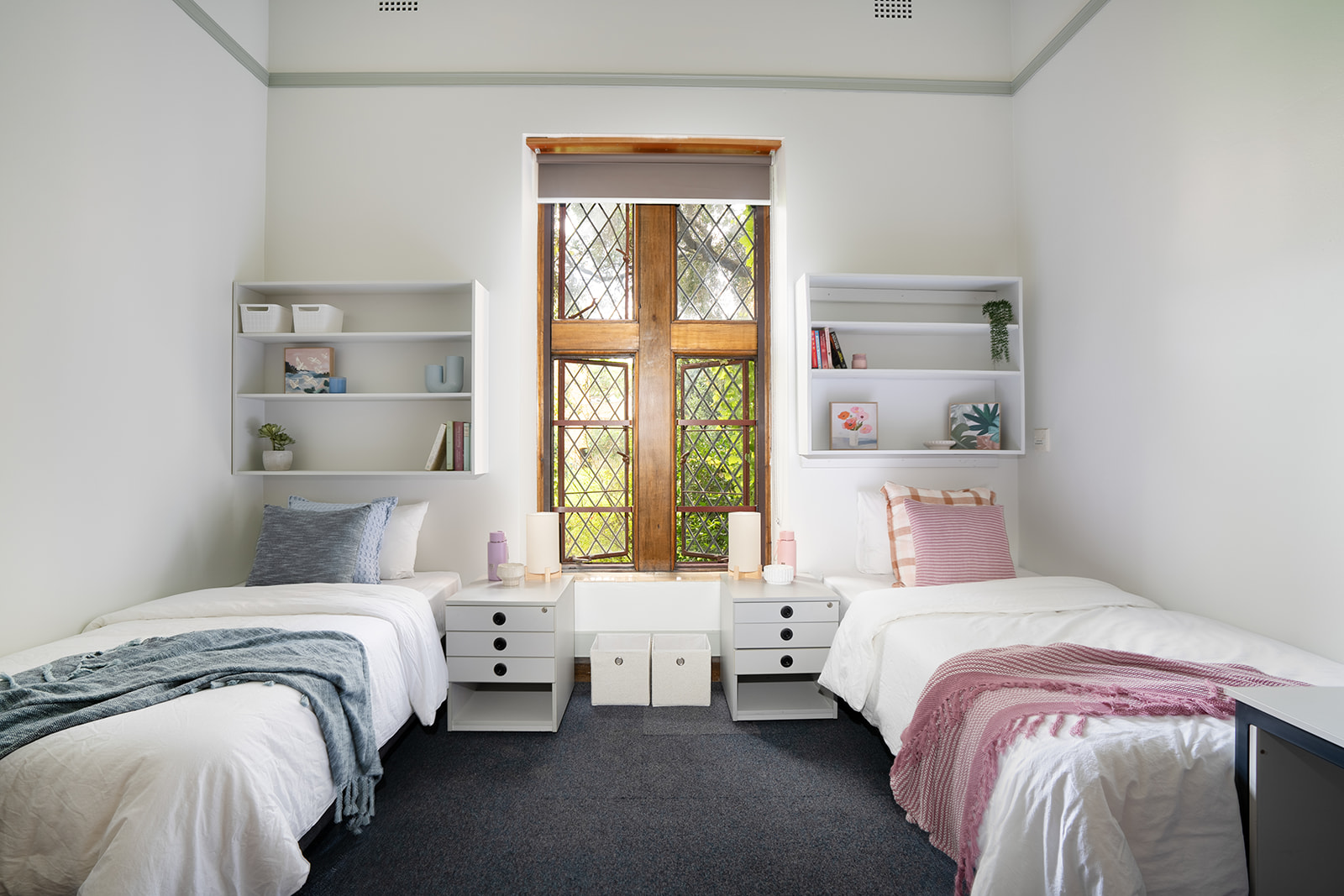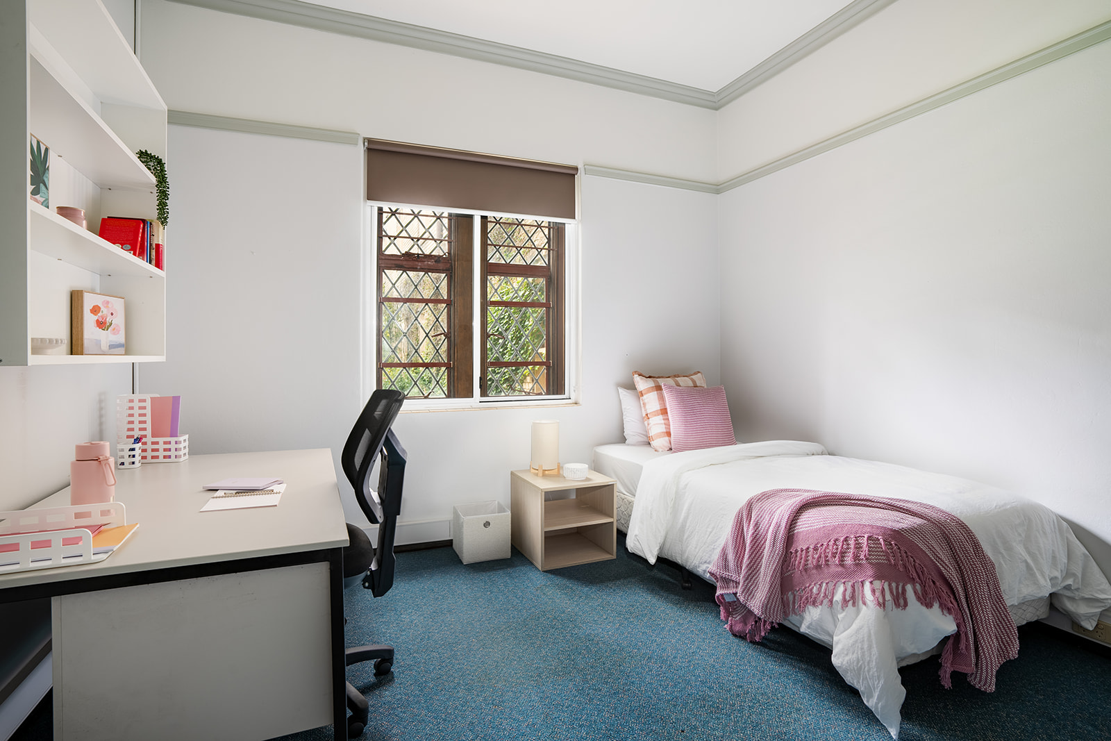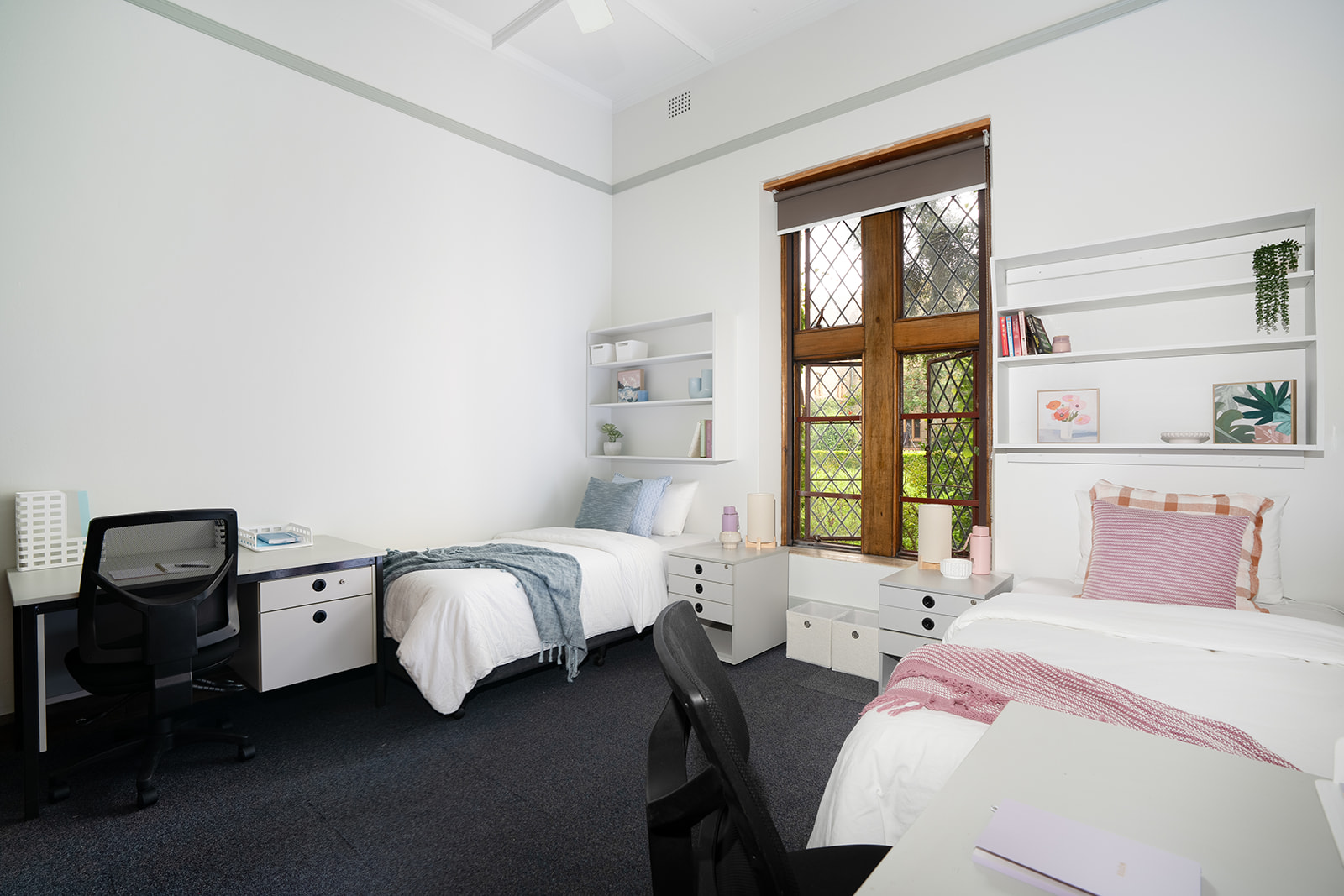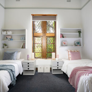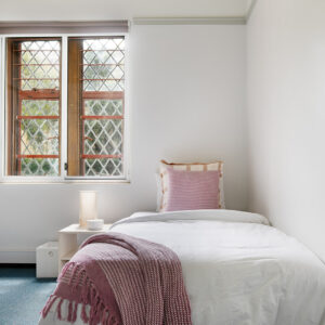 The serene student rooms in Sydney, surrounded by tranquility and brimming with distinctive character, craft a feminine environment steeped in history and evoking a sense of old-world academia.